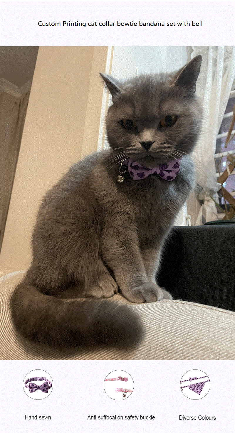 Enhance your feline accessory line with our custom printed cat collar bowtie bandana set with a bell. This stylish and functional set is perfect for cat owners looking for both elegance and practicality.